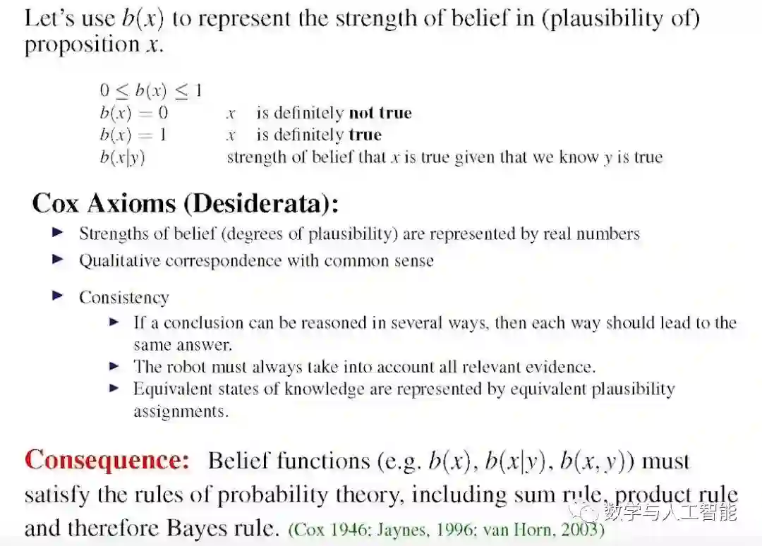 若使用 b(x) 表征命题 x 中的信念强度,那么它的取值应该在 0 到 1 之间,且只有在系统完全确信 x 会发生或完全不确信才能取到 1 和 0。此外,b(x|y) 表示在给定 y 可能会出现的信念下,x 会发生的信念强度。早在 1946 年,Cox Axioms 就写下了一些如何表示信念的定理。如上所示信念的强度应该由一个实数表示,信念应该与常识具有定性的一致性等等。此外,信念函数还应该满足概率定理,包括概率加法、乘法和贝叶斯法则。