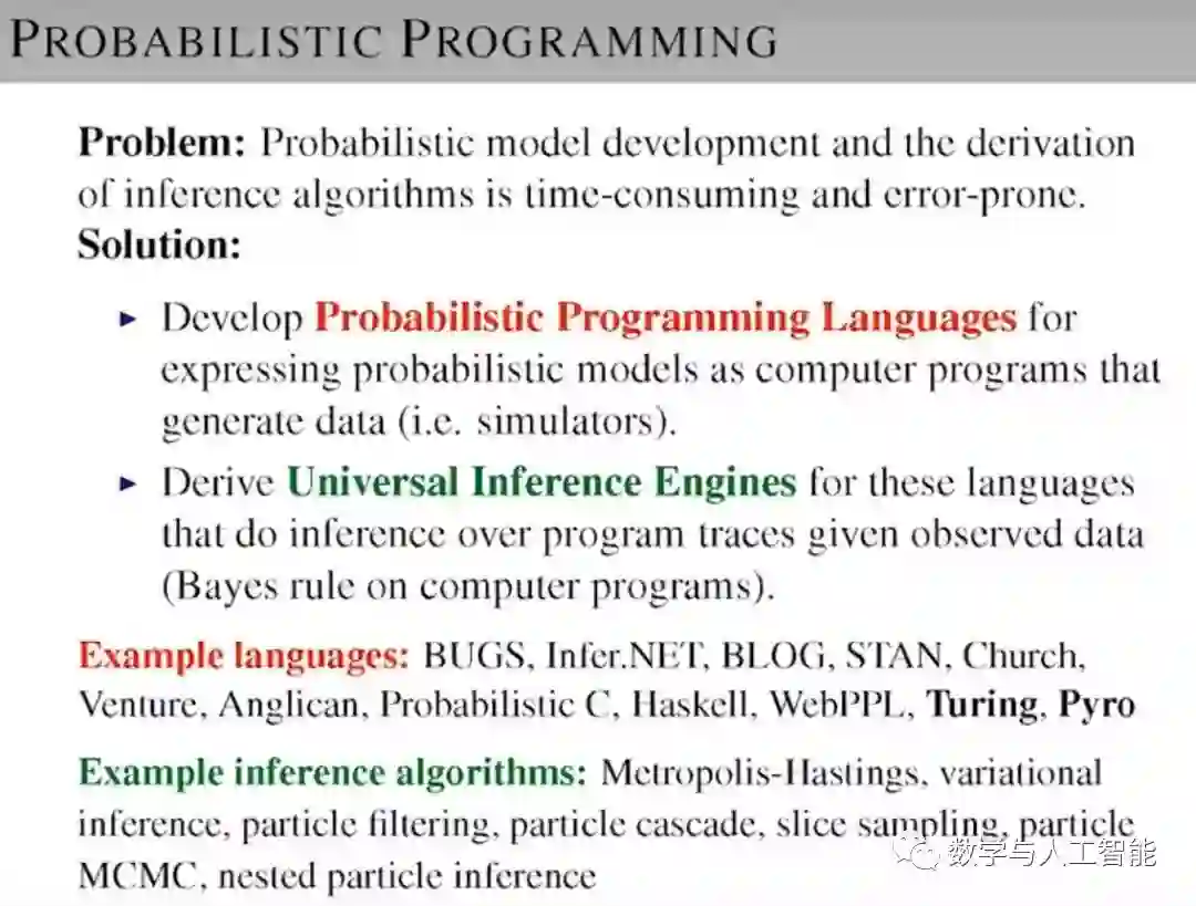 首先对于传统模型而言,概率性模型开发与推断算法的推导式非常耗时与容易出错的,因此我们可以借助概率编程语言将概率模型表述为能生成数据的计算机程序。例如概率编程语言 Edward,它构建于两种组合表示的基础上,即随机变量和推理。Edward 可以集成到 TensorFlow,它让我们轻松使用从点估计到变分推理和 MCMC 等各种可组合的推理方法来拟合相同的模型。