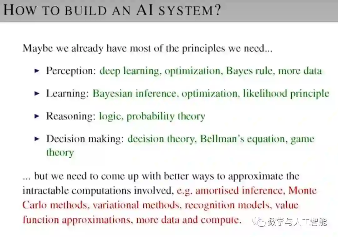 当我们思考人工智能时,会想到我们当前处于什么状态?离我们想要的人工智能还有多远?我们是否有解决未来挑战的理论基础?为了解决赋有挑战性的 AI 任务,我们需要关于感知、学习、推理与决策的理论。这也是我们建立 AI 系统的方式。