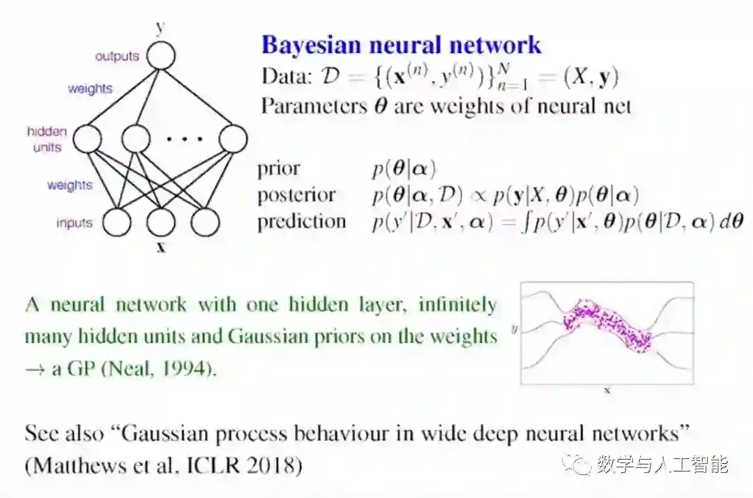 有趣的是,Radford Neal 在 1994 年表示如果从贝叶斯的角度观察带有单个隐藏层的神经网络,那么当该隐藏层的神经元数量可以无限增长,那么模型就会收敛到高斯过程,所有权重都会服从高斯分布。当时很多研究者对这一过程非常感兴趣,但是由于神经网络有非常多的局部极小值且很难优化,因此很多研究者转而关注能优雅使用凸优化的支持向量机。同时,由于单个隐藏层需要无限的神经元才能近似高斯过程,那么我们为什么不直接使用高斯过程呢,这也是当时很多研究者的心声。