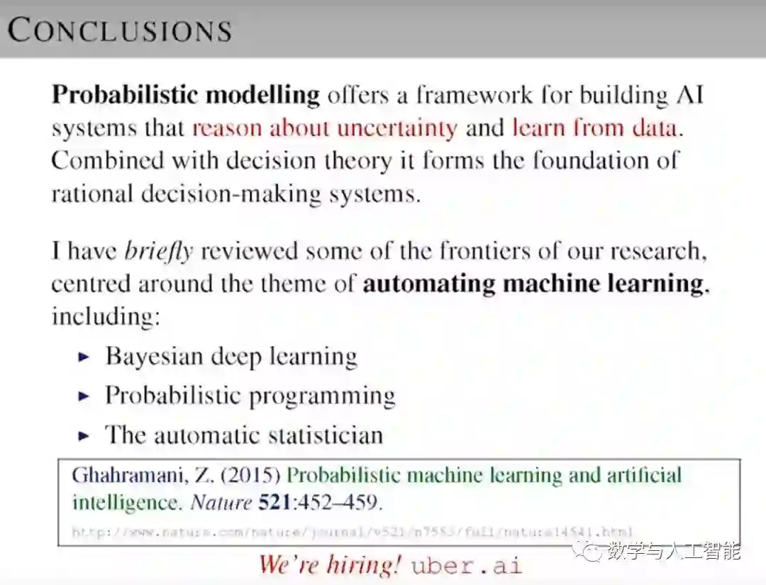 对于整个演讲的总结,Zoubin 表示概率建模为构建理性的 AI 系统提供了非常好的框架,在这个框架下我们能将现实世界中的不确定表示出来,并从数据中学习。
