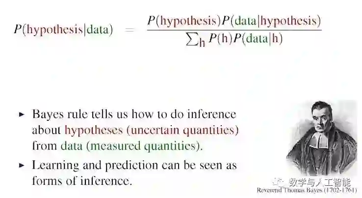 为了进一步解释贝叶斯推断,Zoubin 进一步解释了贝叶斯法则。简单而言,贝叶斯法则可以描述为「执果索因」,即知道某个事件发生了后,求得该事件最可能是在什么情况下发生的。在 ML 中,贝叶斯法则会告诉我们如何更新对未知世界或假设(hypothesis)的知识与信念,且更新假设或信念的信息从我们已知的观察或数据(data)中获取。