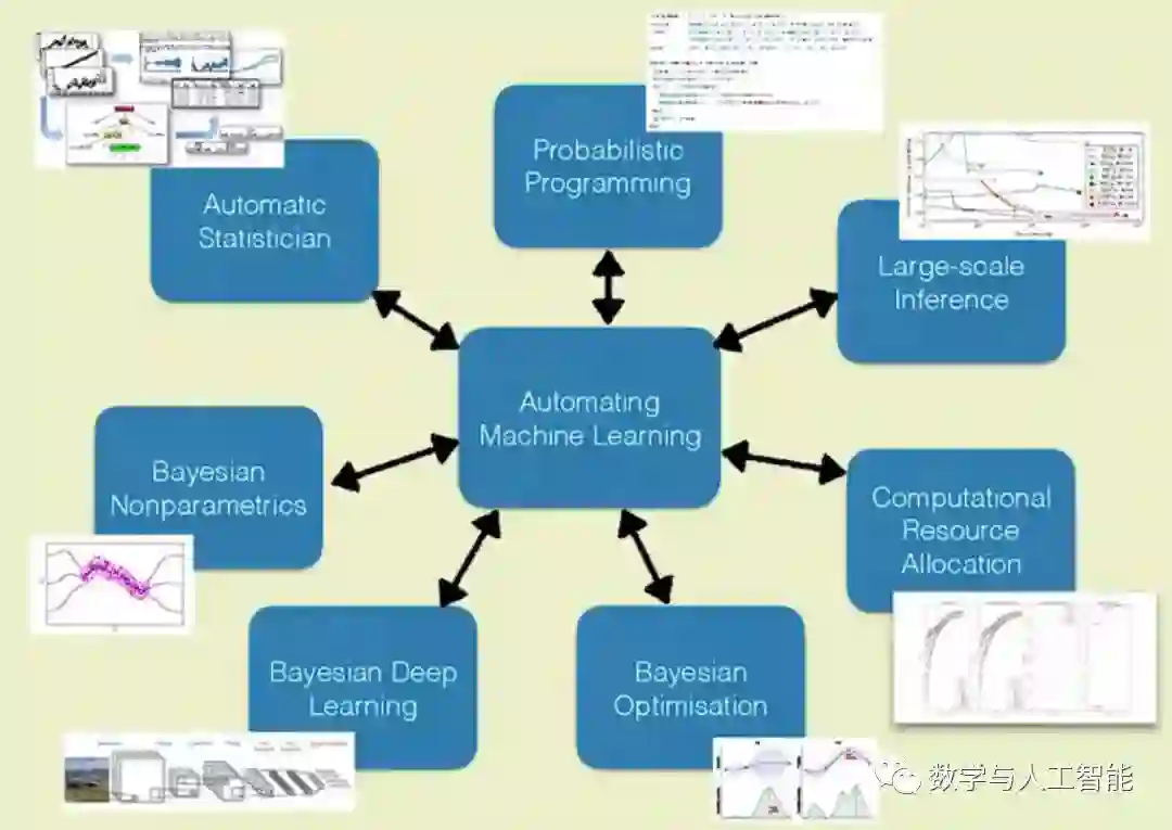 介绍了概率在机器学习中的重要性后,Zoubin 在后面重点讨论了他在这一领域的研究方向与成果。以下展示了他主要涉及的领域,且都以自动化机器学习为中心。之所以在机器学习前加上「自动化」,是应为他认为目前的机器学习并不是那么合理,它还能在很多地方变得更加高效与自动化。
