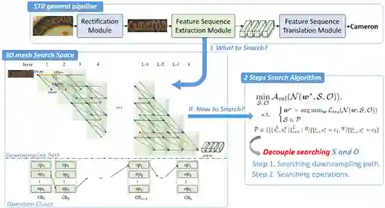 该工作为STR引入了一个特定域的搜索空间,该空间包含下采样路径和操作的选择,并提出了一种新的搜索算法将操作和下采样路径分离,从而在空间中进行有效的搜索。通过在搜索过程中加入一个额外的正则化器,在模型大小与识别精度方面进行了有效的权衡。