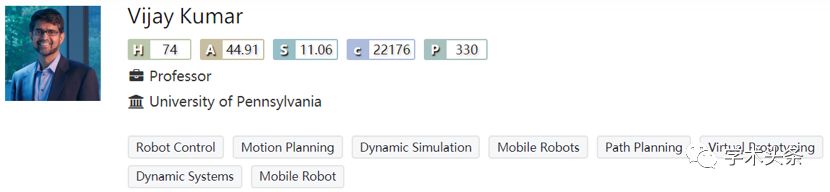 VijayKumar获得俄亥俄州立大学机械工程博士学位后。他在1998-2004年间负责指导宾夕法尼亚大学的GRASP实验室,进行交叉学科的机器人及认知研究。目前,他的研究兴趣主要集中于多机器人系统和微型飞行器,最著名的研究成果在多机器人编队的控制和协调方面。