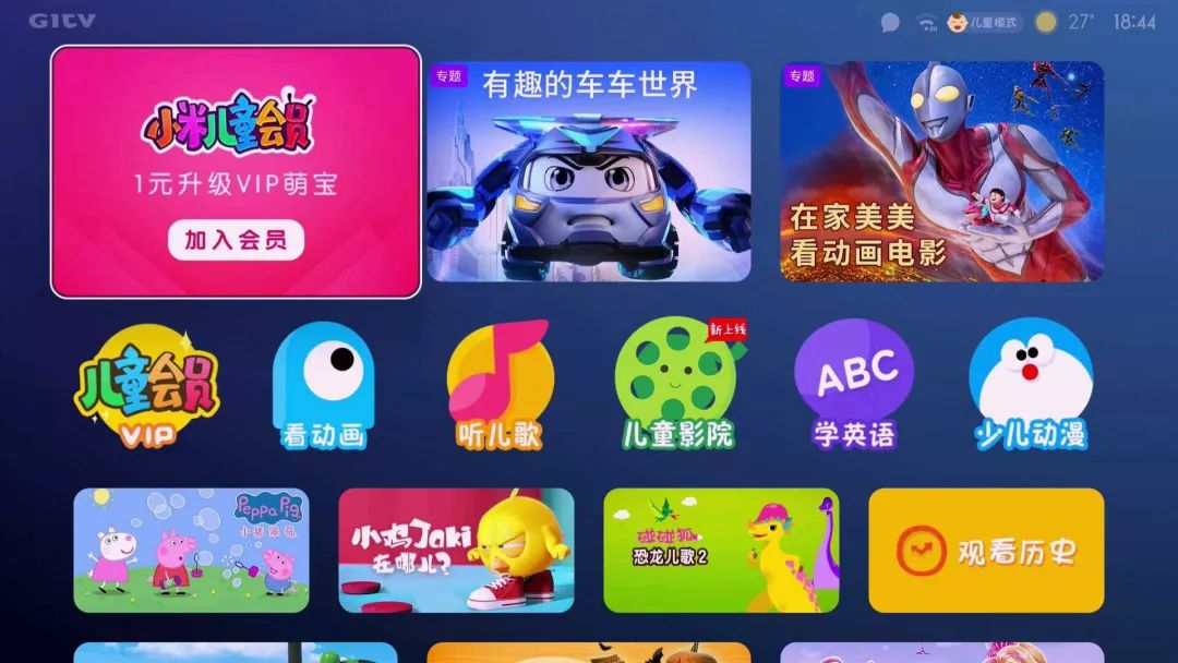 进出小米电视的儿童模式需要输入设置好的四位数密码,儿童模式中的UI界面做了比较大调整,看起来更加卡通、色彩也更温和。更重要的,儿童模式中的视频内容也做了大调整,不适合儿童的资源会被过滤,优先展示小朋友喜欢的动画片、学习资料等。