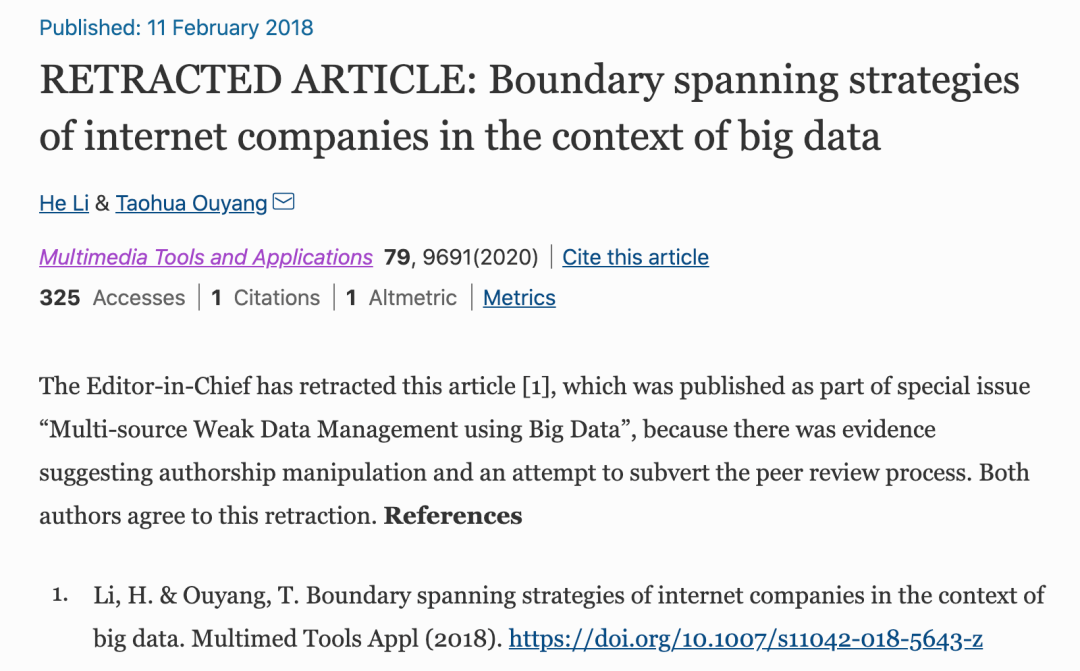 2017 年,施普林格出版集团旗下期刊 Tumor Biology 宣布一次性撤回 107 篇发表于 2012 年至 2016 年的来自中国的医学论文,撤稿原因是论文作者通过「第三方」中介投稿,伪造虚假同行评审。