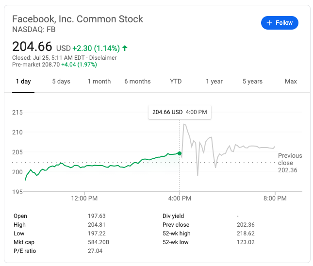 无论如何,这笔罚款似乎给 Facebook 带来了一些好的外界预期——它的股价先是随着 FTC 消息的公布而略有下滑,但在下午就开始回升,最终报收于 1.14% 的增长率。