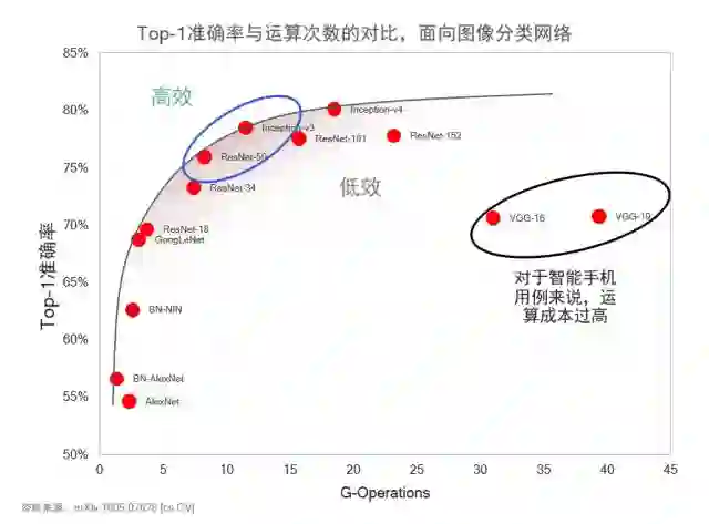 韦灵思:我认为孤立地去看一个算法的压缩比是没有意义的。我曾经在一个神经网络上实现过700倍的压缩比,而且没有损失任何准确率;但这个被压缩的网络本身就是过度冗余的,它是一种VGG网络,这种网络从设计之初效率就很低,因此700倍的压缩比其实不能说明什么。但正如纪磊刚才谈到的,贝叶斯在ResNet-18这个本来已经非常紧凑的网络上实现了3倍压缩比,这充分说明了它的性能。Gary在他的演讲中展示过一个对比不同网络的准确率和运算次数之比的示意图(如下),在这个图中ResNet-18已经处于准确率/运算次数的最优曲线上,所以说贝叶斯3倍的压缩比已经很强大。对于像VGG这类远离最优曲线的冗余网络来说,完全可以实现非常高的压缩比。