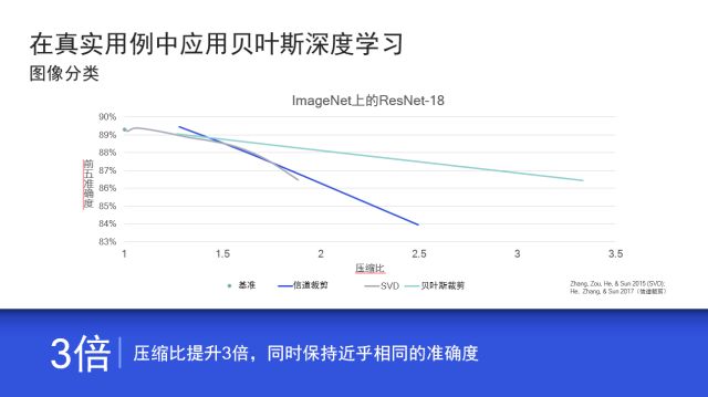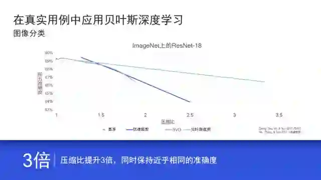 韦灵思:在我的演讲当中为大家展示了一个在图像分类的实际用例中对比不同神经网络压缩方法的示意图(如下)。从这个示意图中可以看到,贝叶斯在高压缩比的情况下尤其展现出了明显的性能优势。至于具体的数字,在不同实际用例中我们会得到不同的数据对比。除了图像分类外,我们还在其他用例下做了对比实验。总的来说,贝叶斯可以将网络规模压缩得更小、量化程度更高,同时不损失过多的准确性,这是非常好的一个方法。