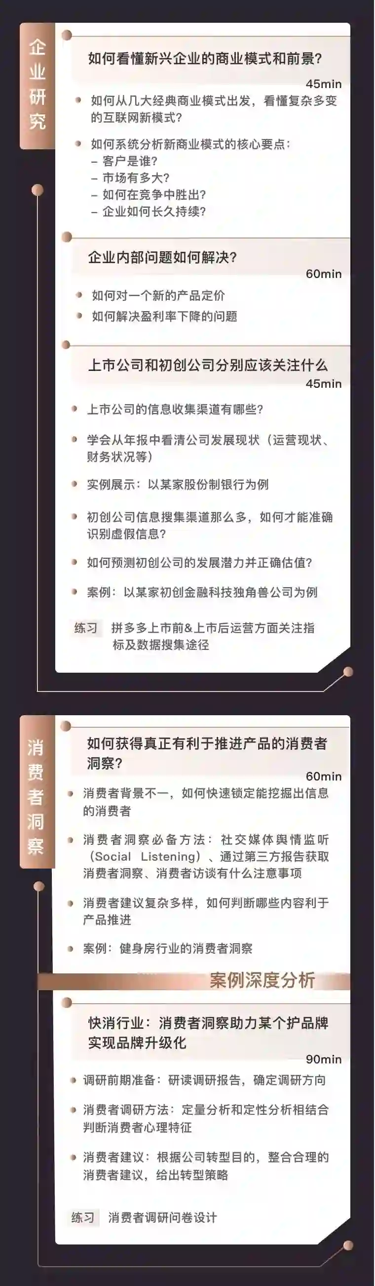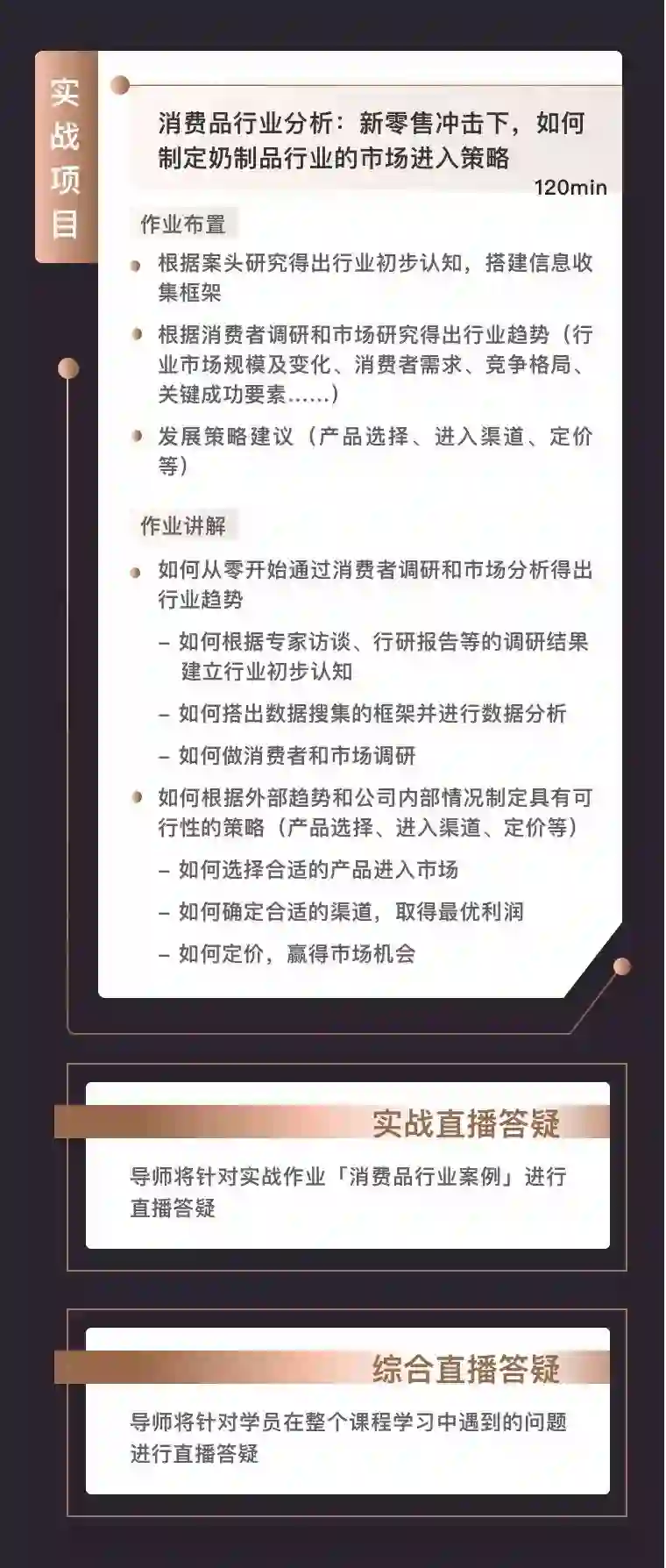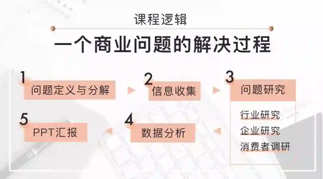 课程设计逻辑就是「一个商业问题的界定-分析-汇报」,完整涵盖顶级商业分析师的工作流程,既有数据搜集行业研究、企业研究、消费者研究,也有Excel数据分析,PPT制作。