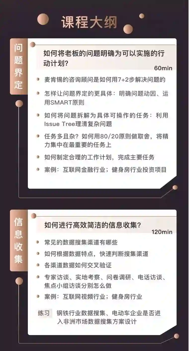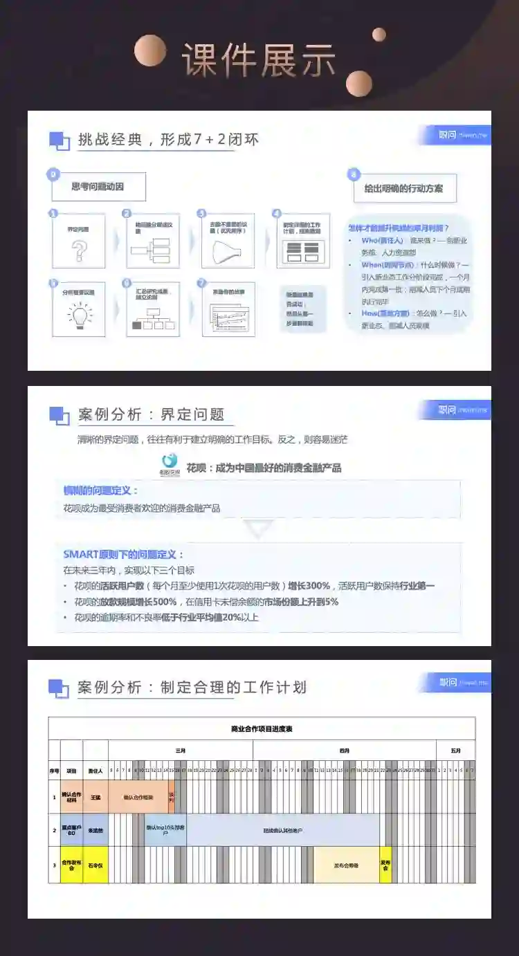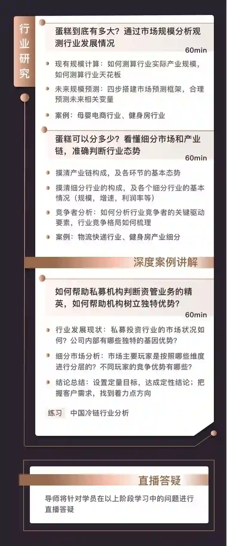 课程设计逻辑就是「一个商业问题的界定-分析-汇报」,完整涵盖顶级商业分析师的工作流程,既有数据搜集行业研究、企业研究、消费者研究,也有Excel数据分析,PPT制作。
