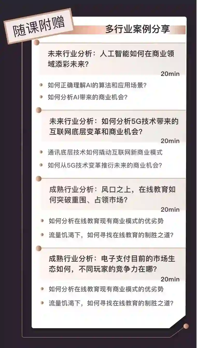 本课程有7大模块,含20节录播课程,3节直播答疑课程,课程总时长23+小时,同时随课赠送3个热门行业案例分享。
