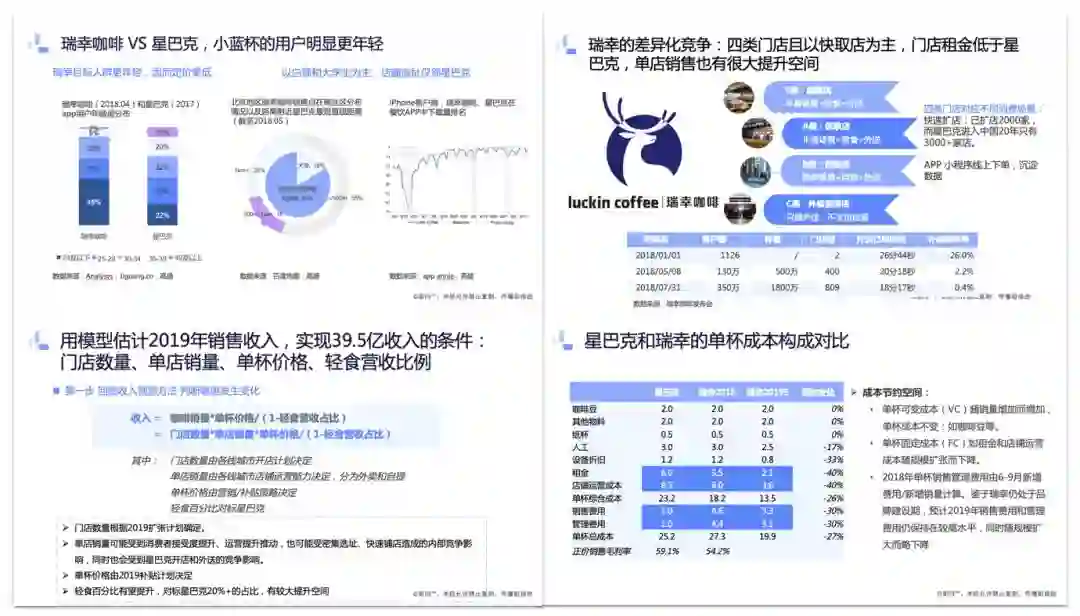 例如,老板总是会让我们做竞品研究,假如你是星巴克的员工,现在你需要分析最新崛起的竞品--瑞幸咖啡,很多人的第一反应就是百度、知乎上搜瑞幸,辛苦拼凑出来的PPT,总是文字过多,没有数据支撑,也没有清晰逻辑。