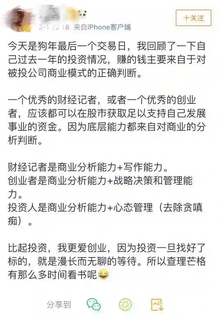 (做投资的网友在微博分享,商业分析能力是赚钱的关键)
