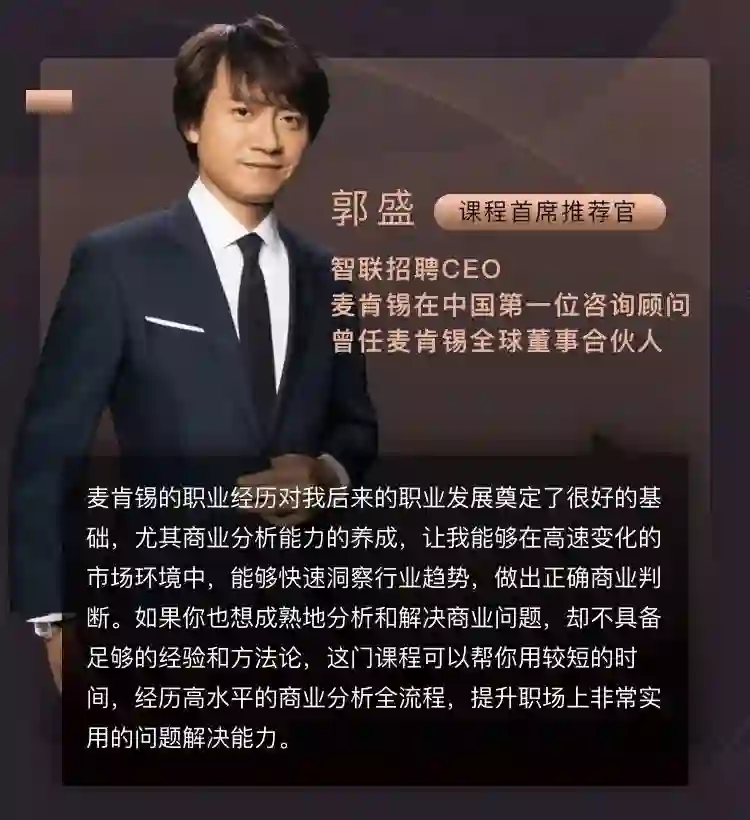 课程的全面升级,得到了麦肯锡在中国第一位咨询顾问、现任智联招聘 CEO 郭盛先生的高度认可和推荐——