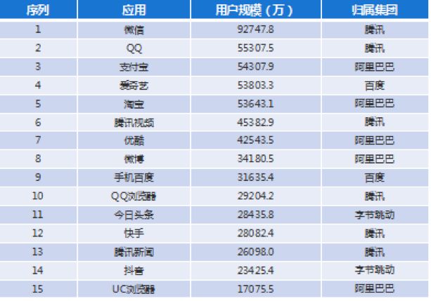 市场头部媒体竞争格局初步明朗,媒体资源集中于头部媒体,从2018年12月全网月活跃用户规模TOP 15可以发现,流量主要集中在腾讯、阿里巴巴、百度手中。