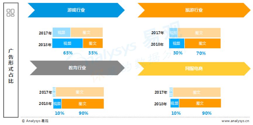 目前市场中的广告形式仍旧以图文广告为主,但视频类广告相比2017年有20%增长。