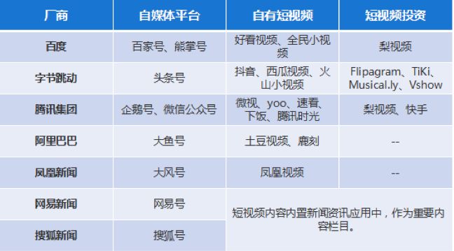 在内容方面,头部厂商均在加大投入,提升内容质量,丰富内容展现形式,其中大型互联网厂商均将短视频内容嵌入资讯产品,领先厂商在此基础上则通过内部孵化+外部收购方式占领短视频市场。