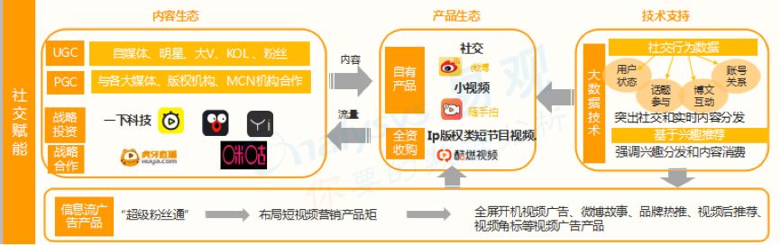 微博完善产品生态,尤其在视频产品方面,通过自身产品内嵌微博故事,小视频等;开发独立APP随手拍小视频;收购酷燃视频;战略投资一下科技等方式完善产品生态。