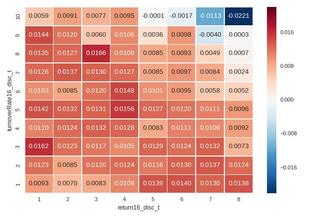 这里使用uqer DataAPI月度行情数据中的单月换手率和单月收益率,通过非独立双排序先根据换手率高低排成10大组,然后在每一大组中再根据近一个月的换手率再排成8个小组,然后统计每组中下个月的平均收益率(相当于等权组合),结果如下: