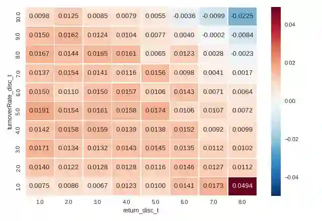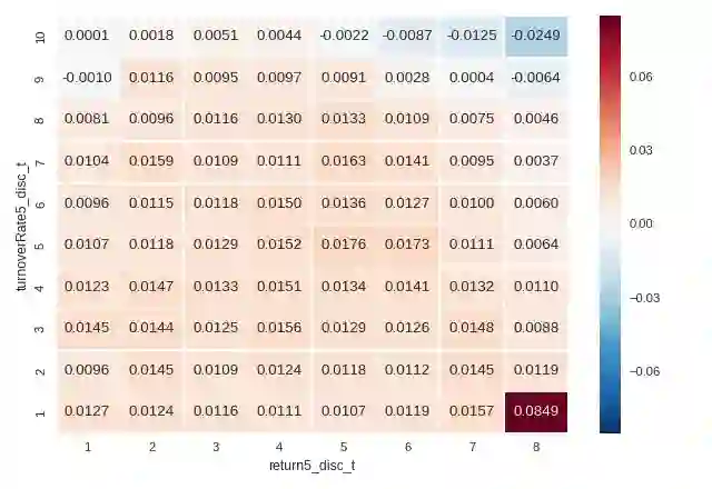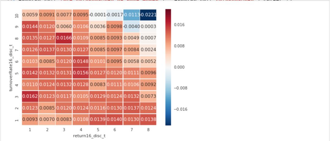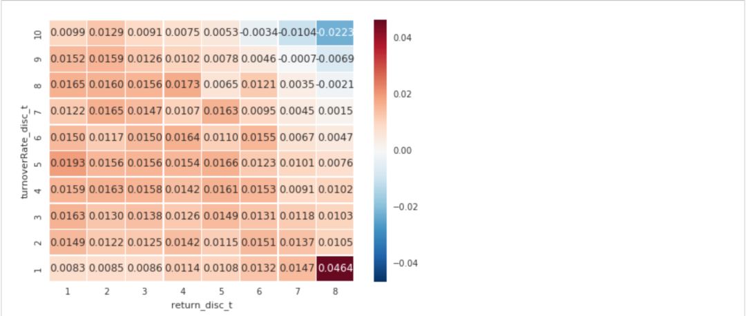 其中y轴代表换手率从低到高的十个大组,x轴代表单月收益率从低到高的分组,组号越大代表该组别对应因子值越大。从上图可以看出: