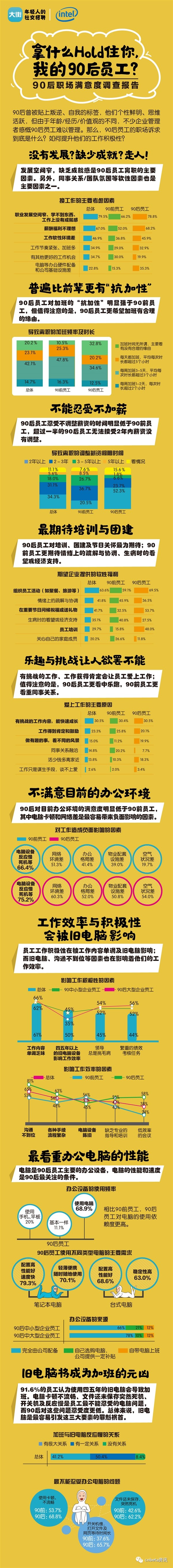 越来越多的90后进入职场,他们在就业、加班、薪酬方面有哪些特点呢?近日,Intel联合大街网发布《拿什么HOLD住你,我的90后员工?——90后职场满意度调查报告》。报告显示,对比90前员工,90后员工对于目前办公环境的满意度明显更低,其中电脑卡顿和网络差是最容易对他们的工作造成负面影响的因素。