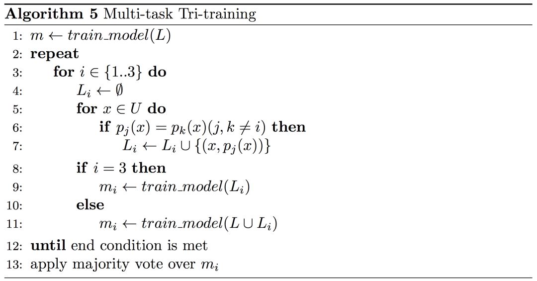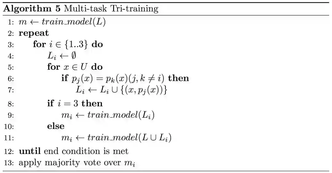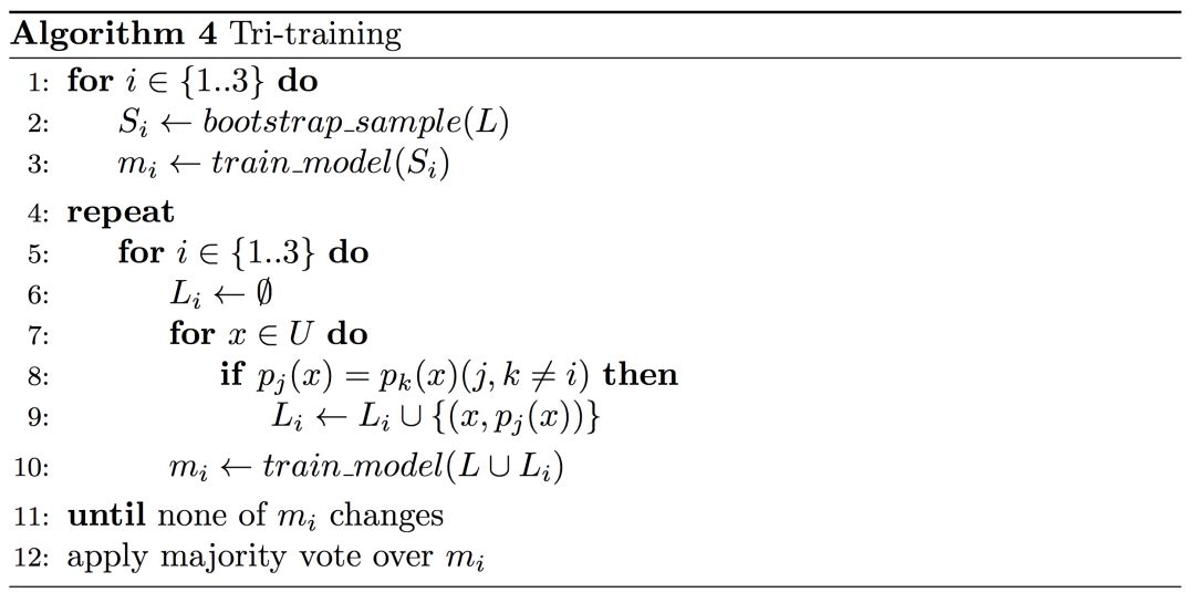 Tri-training的一个主要前提是初始模型必须是多样的,这和Democratic Co-learning一样,但后者实现的方法是使用不同的的架构,而前者则是从原始训练数据L中用Bootstrap采样机制获得不同变体Si。在这些采样变体上分别训练出m1、m2、m3三个模型后,它们无需计算置信度,只需按照“少数服从多数”的做法筛选出标签。例如对于预测标签,模型mj和mk表示强烈同意,但模型mi不置可否,那么算法会为样本生成多数同意的伪标签,然后把它放入mi的训练集。