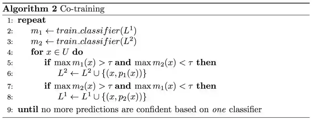 Co-training有m1和m2两个模型,它们分别在不同的特征集上训练。每轮迭代中,如果两个模型里的一个,比如模型m1认为自己对样本x的分类是可信的,置信度高,分类概率大于阈值τ,那m1会为它生成伪标签,然后把它放入m2的训练集。简而言之,一个模型会为另一个模型的输入提供标签。以下是它的伪代码: