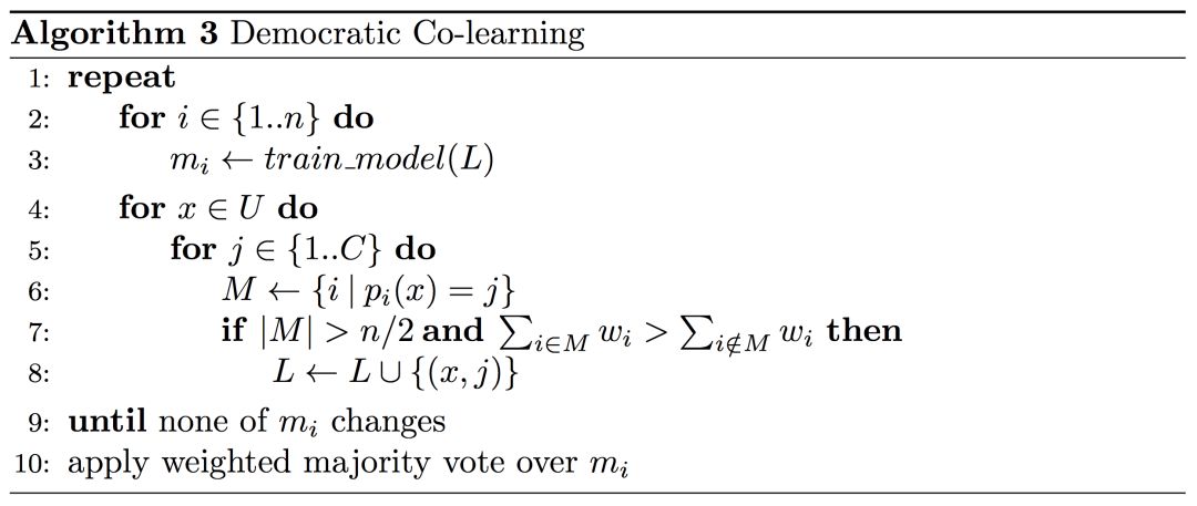 Democratic Co-learning首先会在数据集L上单独训练各模型,之后它再用这些模型对数据集U中的样本进行分类预测。如果大多数模型对样本的分类给出了可信度较高的结果,那它会给样本生成标签,并放入数据集L中。这个置信度的判断标准是对于标签分类结果,赞同模型的置信度平均值w之和是否大于不赞同模型的置信度的均值总和。
