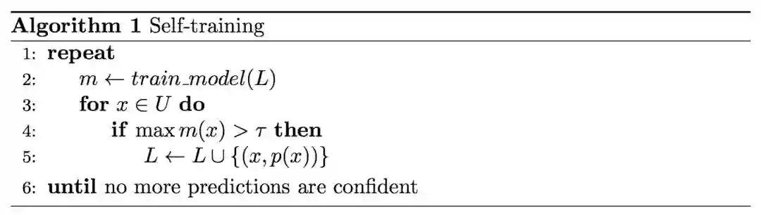 形式上,Self-training有一个模型m、一个含标签训练数据集L和一个不含标签数据集U。每次迭代中,模型m会基于标签集C,为U中的样本x生成一个标签概率m(x)。如果m(x)大于阈值τ,我们就用p(x)=argmax m(x)为样本x生成一个伪标签(pseudo-label),然后把它归入训练集L中。