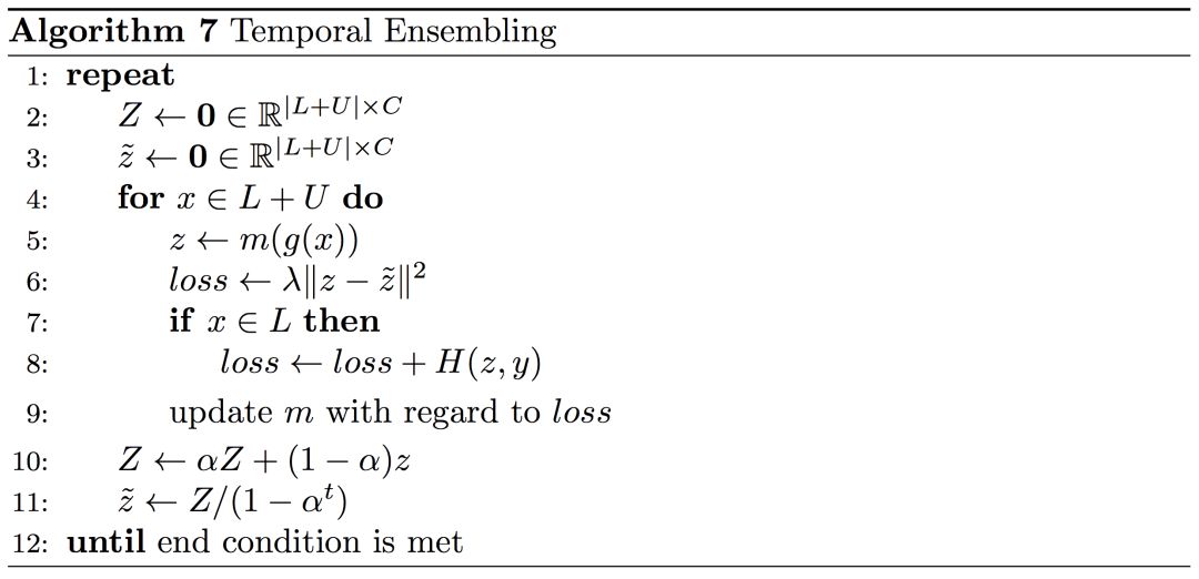 这是Laine和Aila在2017年提出的一种新型伪标签提升方法。它不再基于已有干净标签生成伪标签,而是通过对输入数据添加两种不同的扰动和两个不同的正则条件(dropout)z和z̃,来让模型学习其中的不变性。