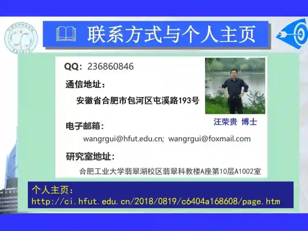 汪荣贵,合肥工业大学人工智能学院教授、博士生导师。主要研究方向为嵌入式多媒体技术、图像理解与机器学习、视频大数据与云计算。承担完成多项国家自然基金项目、安徽省科技攻关及企业委托项目,近期研究成果“多源多模态视频智能处理关键技术及应用”获得安徽省科技进步二等奖、“多源多模态视频智能处理在平安城市中的应用”获得合肥市科技进步一等奖、“虚拟卡口”获得中国电子集团科技进步一等奖。主编出版的教材《离散数学及其应用》、《算法设计与应用》和《机器学习及其应用》获得广大读者的好评。