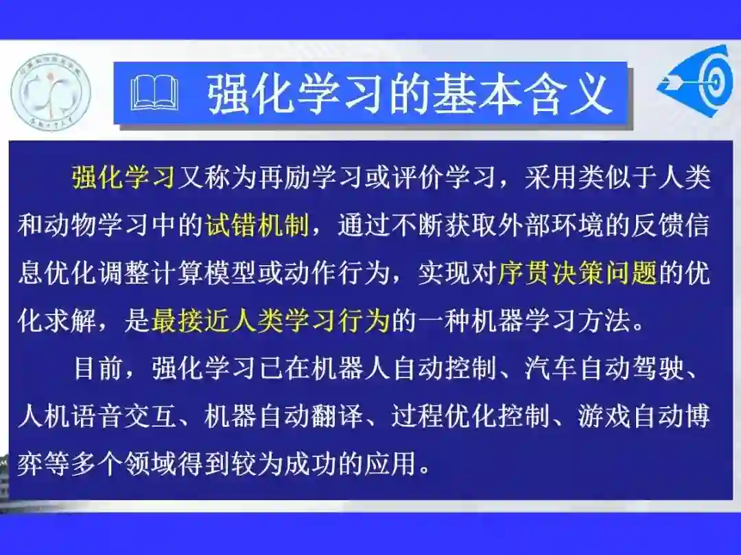 强化学习又称为再励学习或评价学习,采用类似于人类和动物学习中的试错机制,通过不断获取外部环境的反馈信息优化调整计算模型或动作行为,实现对序贯决策问题的优化求解。由于外部环境反馈信息的形式和内容比样本数据更加灵活广泛且可以在线获取,故强化学习具有非常广泛的应用前景,被认为是一种最接近人类学习行为的学习方法。