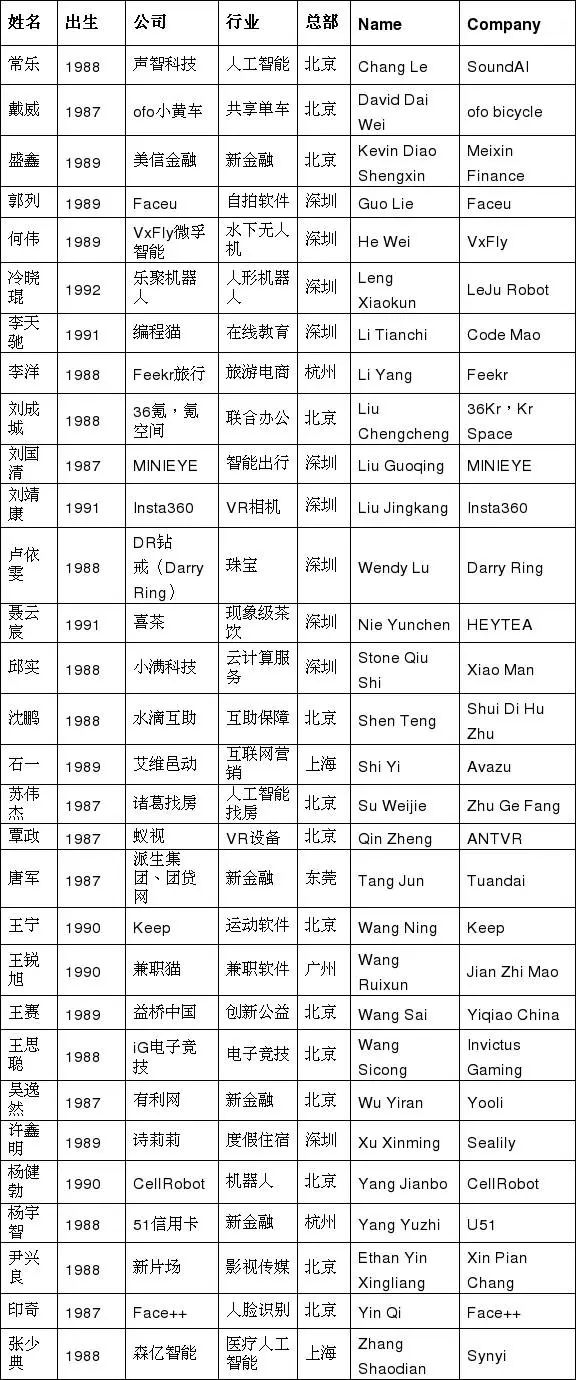 9月22日下午,胡润研究院发布《2017胡润30X30创业领袖》,胡润研究院称,综合考量创业者的创新精神、行业影响力、在80后、90后圈子内的影响力以及正能量指数,并衡量公司规模及融资状况后选出30位30岁以下的创业领袖。