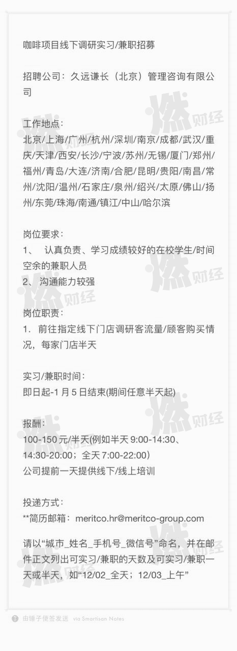 Anne 参与实地蹲点的实习生 去年12月的一天,我在一个兼职群看到了“咖啡厅统计人员”的招聘通知,工作时间是7:00到22:00,一人一天200元。入职后我才知道,我们是要去瑞幸咖啡的门店蹲点,调查瑞幸的订单量和客流量。负责管理我们的,是招聘我们的当地领队,但领队背后的甲方,应该是汇生咨询,因为工作群中有汇生的人,他们会监督领队的工作。但汇生一直没有出面,这次调查外包给上海专门招兼职的团队,相当于包工头,和兼职者直接接触的是领队,电话语音培训、人员分配、工资发放、甚至最后的数据核对,都是领队在做。当时应聘几乎是零门槛,没有任何要求,所以我去了之后发现兼职者从未成年到中年,各个年龄段的人都有,年纪最小的只有16岁。我们的任务,是在店里记录订单量和客流量。当时一起入职的兼职,第一批有四五十人,一个店派一个人,上海地区一共88家店,我一共调查了两家店。如果这个调查员记录的数据不完整或者被查出来人不在店内,就会招聘新的人员在别的日期再对这家店进行统计。按照要求,一人拿多杯算一杯,多人拿一杯算一杯,一个外卖袋子算一杯,但是兼职有很多按照自己方法来算的,比如听来单的声音统计。现场记录主要分两种,一种是在纸上画正,一种是用手机计数器。现场基本没有出现兼职被赶出去的情况,但有的纯外带和外送的店,没有座位,兼职会在外面站一天。暗访瑞幸咖啡店实习生微信群截图 受访者供图但是我们的兼职不包括录视频,因为瑞幸咖啡店没有充电口,一个充电宝也不足以录十二个小时视频。兼职上岗后的第二天,汇生方面派了员工到店里抽查兼职的情况,发现了一大批渎职的兼职,领队赶紧到没有甲方(汇生)的群里监督兼职,并对第一批被查出来兼职不在岗的店的数据进行返工重做。本来去年12月2日、3日、7日三天就能搞定所有店,最后到12月19日还有几个店没做完。我们的工资是领队核对数据过后才发。核对过后,又过了大概十来天才发,对方给出的理由是公司要财务审批。这种社会兼职一般是隔天结工资,结果这次隔了十来天。这次的领队,要负责的事情很多,其中还有核对业务。兼职需要每个小时把数据填进问卷里,数据导出来就有十二个小时的数据,由于很多兼职填错,给领队增添了非常多工作量。从调查的过程来看,我觉得领队是不太专业的,毕竟他们只是做具体的执行。作为甲方的咨询公司人手有限,要调查那么多店,也只能外包给当地领队了。但最后出来的做空报告,确实还是非常专业的。其实很难得看到咨询公司做项目是找上包工头、零门槛招社会兼职的。一般的咨询公司都是招在校生做PTA(兼职项目助理),厉害的咨询公司的PTA,不给工资都有人抢着干。去年11月25日,汇生还在招PTA做瑞幸项目,后面发现人手不够,只能开始招兼职。*应受访者要求,Miky、Aaron、Eason、Sam、Anne均为化名。