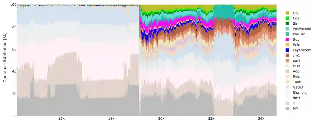 图 4. 算子随时间推移的分布。在开始阶段,生成器使用核心 DSL(渐灰色),随着架构表征的稳定,开始使用扩展 DSL。
