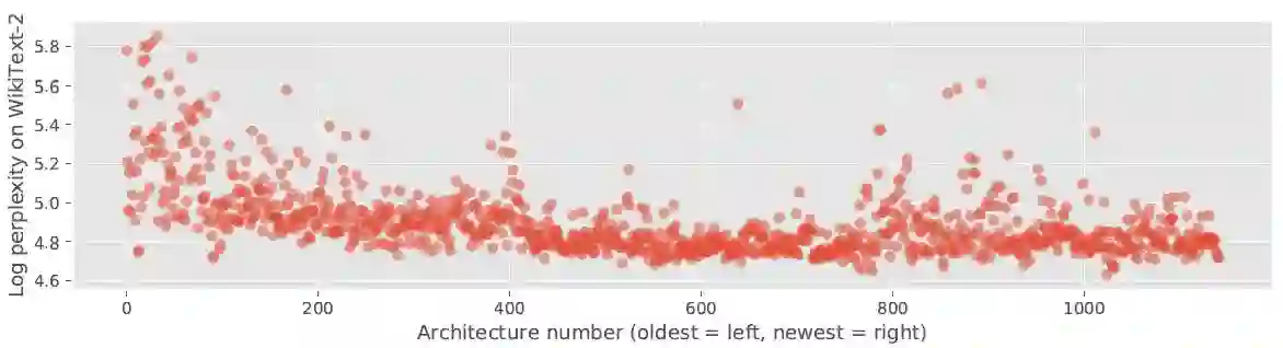 图 3. 语言建模架构搜索随时间推移的可视化。越低的 log 困惑度(y 轴)越好。