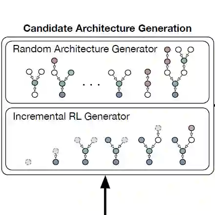 图 1. 生成器通过迭代采样下一节点产生候选架构(随机地或者使用由 REINFORCE 训练的 RL 智能体)。排序函数处理完整架构并评估最有希望的候选架构。在基线实验上运行模型的结果接着用于提升生成器和排序函数。