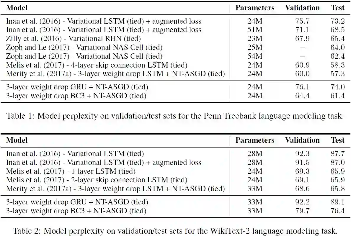 表 1. Penn Treebank 语言建模任务上验证集/测试集的模型困惑度;表 2.WikiText-2 语言建模任务上验证集/测试集的模型困惑度。