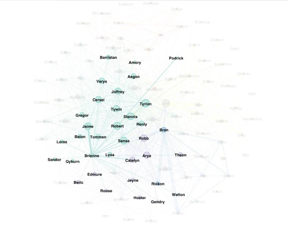 在聚类的结果中,可以看到角色们基本按照剧情发生的地理位置被归类。以囧雪为代表的守夜人故事线(黄色);狼少主、小剥皮代表的北境故事线(紫色);布兰代表的长城之外故事线(蓝色);龙妈代表的海外故事线(橙色);以及最大最密集的小恶魔、瑟后、詹姆、三傻、斯坦尼斯为代表的君临故事线(绿色)。