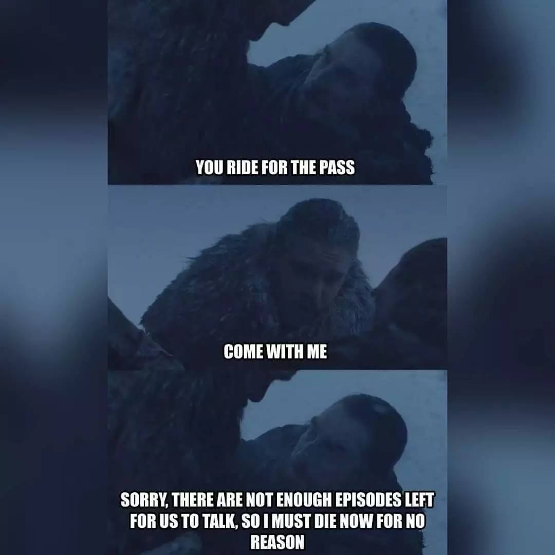(图片说明:由于受电视剧长度的限制,在第七季的冰火中,编剧为了火速推进剧情,抛弃了大量的伏笔和细节,导致 bug 无数。Instagram 等社交网络出现了大量网友自制表情包,讽刺剧组的这种省事儿的做法。图为讽刺囧雪的叔叔班扬史塔克,在第七季第六集莫名其妙地出现然后又牺牲的桥段;图片来源:Instagram @thronesmemes )