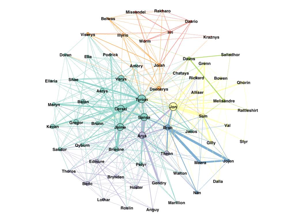 这张图可以清晰地看出原著系列的主要角色。囧雪 Jon 和小恶魔 Tyrion ,Stannis ,Robb ,Robert ,Jamie ,Cersi 的圆圈都很大,而且关系网络密集。相比之下,Robb 和 Edd 就比较小了,而且与他们相似大小的角色还有辣么多,显然他们并不是真主角。