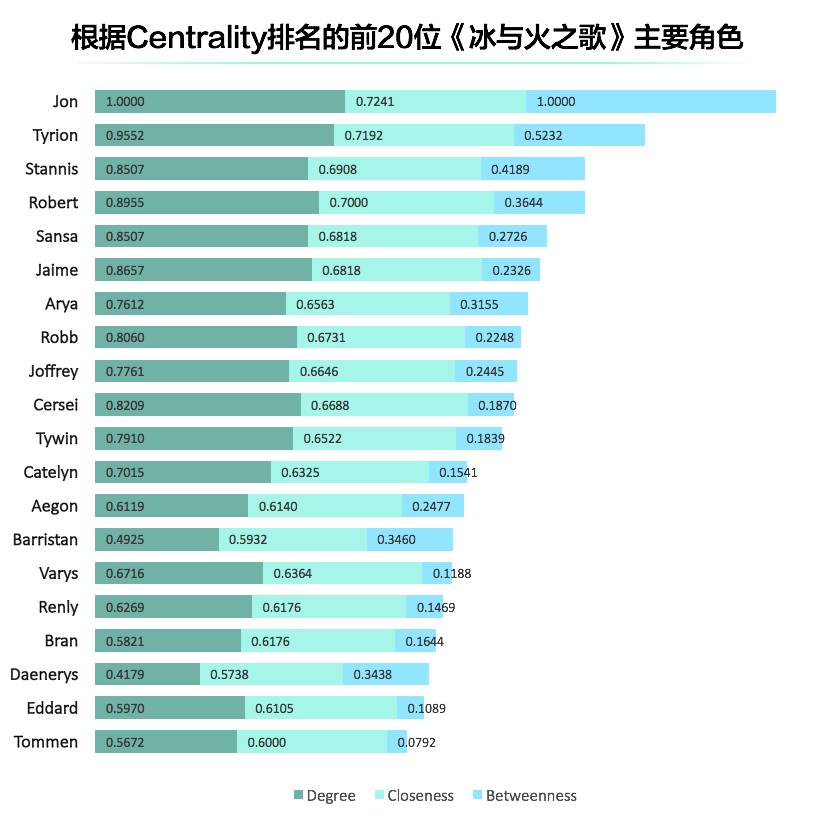 对比这三个主要指标,这么看,Jon 和 Tyrion 已经把其他人远远甩在身后。虽然在看书的时候,我也已经隐约猜到,但是从数据看,还是更加深了我的判断——他们才是真主角啊!(咦,龙母 Daenerys 怎么排名这么靠后?) 狼爸、狼少主、鹿国王等人虽然排名也很靠前,但是与他们相似的角色还有很多。所以你们就安心的领便当吧。