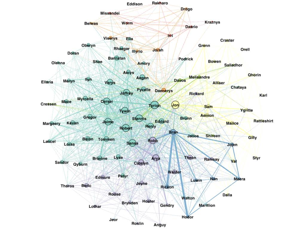 我统计了已出版的五本书的英文原文,检索了所有出现人物的名字。如果两个人物的名字一起出现在14个单词以内,我就认为人物 A 和人物 B 有了一次交集,就会在他们之间连一条线。然后依据这些人物关系绘制了下面这张《冰与火之歌》社交网络图: