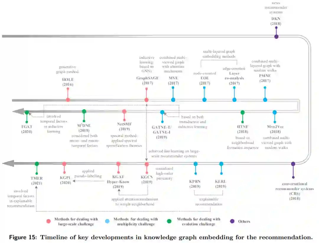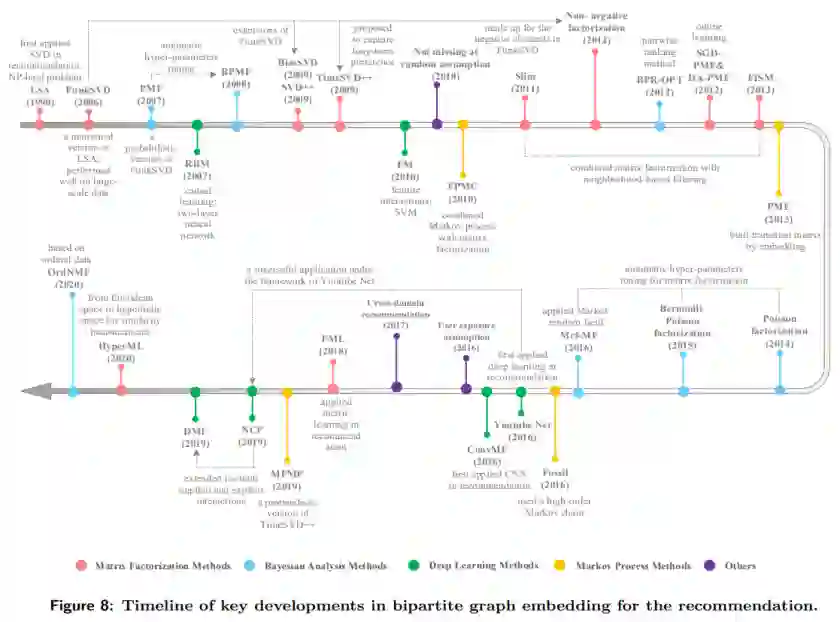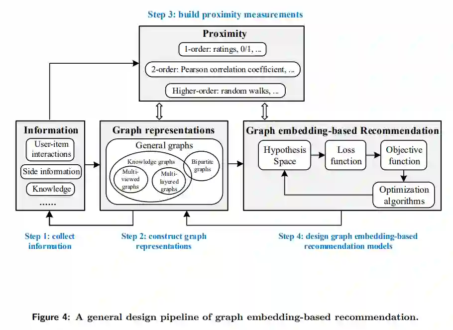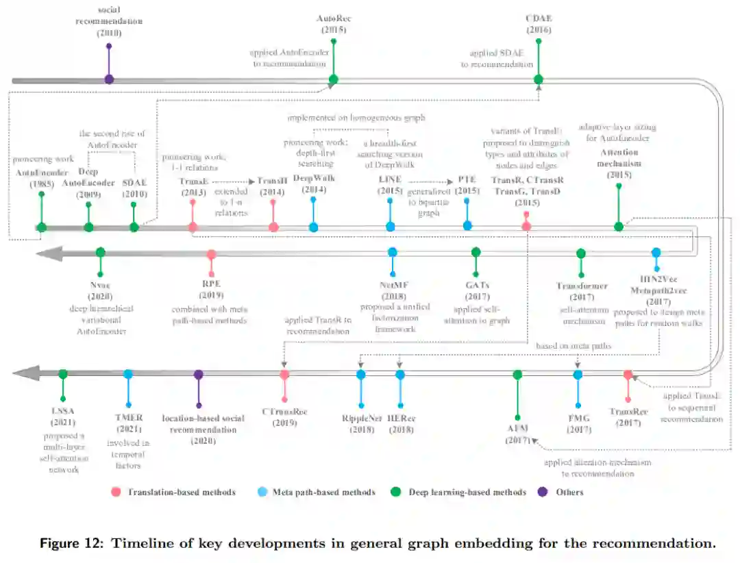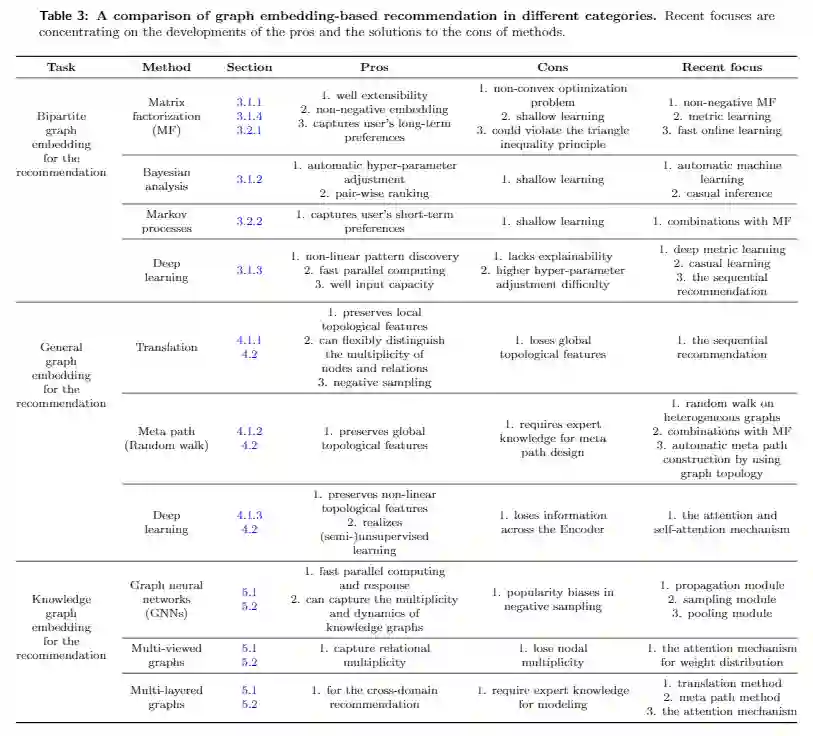 为了推动这一趋势,本文号召来自不同学科领域的研究人员开展交叉研究合作。对此,关于传统推荐和基于图嵌入技术的推荐的详尽的综述是实现如此沟通的桥梁。虽然前者已具备,但纵观近几年发表的综述后,发现后者仍缺失。本文旨在对其进行弥补,分别从二部图、广义图和知识图谱的视角系统地综述了图嵌入技术及相应的推荐模型,总结为下面三张图所示。