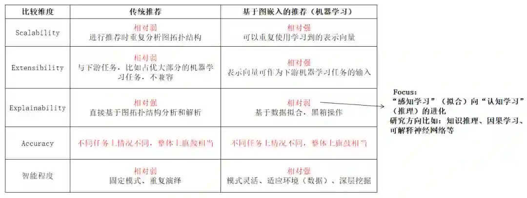 纵观推荐系统这十几年的发展,可谓是“从网络拓扑结构分析到机器学习、从传统推荐到基于图嵌入的推荐、从仅利用用户-物品交互记录到融入边信息和知识、从模型准确性延伸出对模型可扩展性等的要求”。在此趋势下,基于图嵌入的推荐系统是否就可以取代传统推荐呢?本文从理论上比较了这两者间的优劣势,总结为如下图所示。