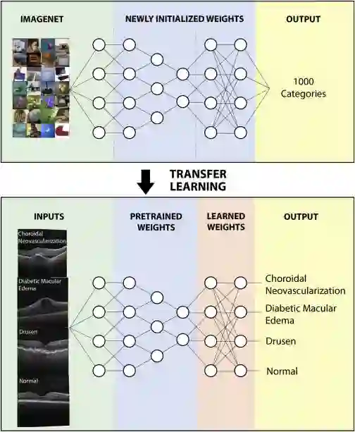 张康:「迁移学习」被认为是一种高效的学习技术,尤其是面临相对有限的训练数据时。相较于其他大多数学习模型的「从零开始」,「迁移学习」利用卷积神经网络(Convolutional Neural Network,CNN)学习已有的已经标记好的预训练网络系统,以医学图像学习为例,该系统会识别预系统中图像的特点,我们再继续导入含有第一层图像相似参数和结构的网络系统,最终构建出终极层级。在我们的系统中,第一层网络就是视网膜 OCT 图像,第二级网络系统使用第一级的图像寻找相应的特点,通过前向传播固定低层图像中的权重,找到已经学习的可辨别的结构,再提取更高层的权重,在其中进行反复的自我调整和反馈、传递,达到学习区分特定类型的图像的目的。我们首次使用如此庞大的标注好的高质量视网膜 OCT 数据进行迁移学习,进行常见视网膜致盲性疾病的检测及推荐治疗手段,得到与人类医生相似甚至更高的准确性。此人工智能系统还可以「举一反三」,将迁移学习用于小儿肺炎诊断。