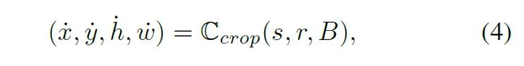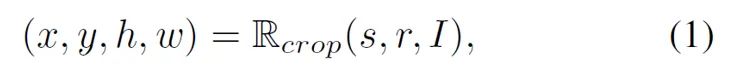 其中s代表了crop的大小(scale),r是crop的高宽比(aspect ratio),I是输入图片,Rcrop代表了随机裁剪函数,它返回一个四元组(x, y, h, w),分别定义了crop的中心坐标以及高宽。