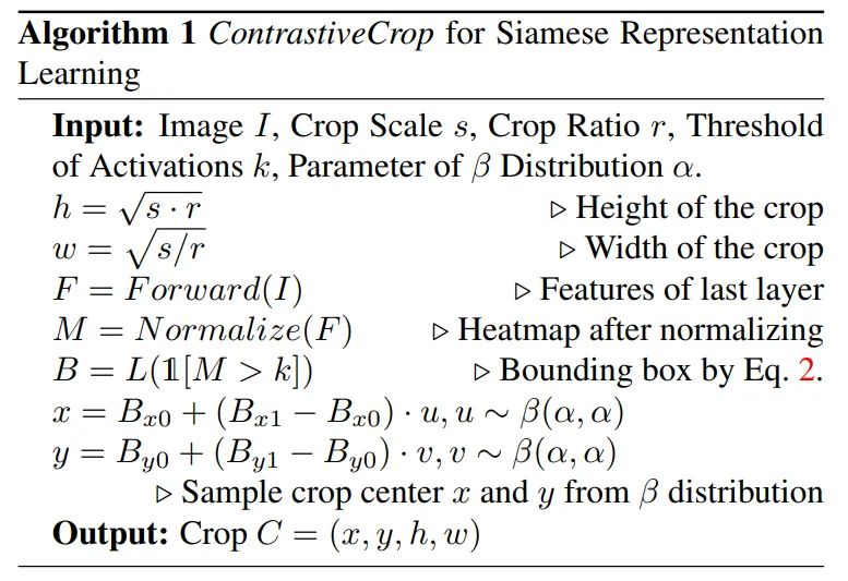 其中 是代表中心压制采样的函数,B是式(2)中的定位框。ContrastiveCrop的效果在图3中有展示(第三行)。它有效地去除了绝大部分的错误正样本对,同时增大了正样本之间的差异性。整个ContrastiveCrop的流程在算法1中展示。